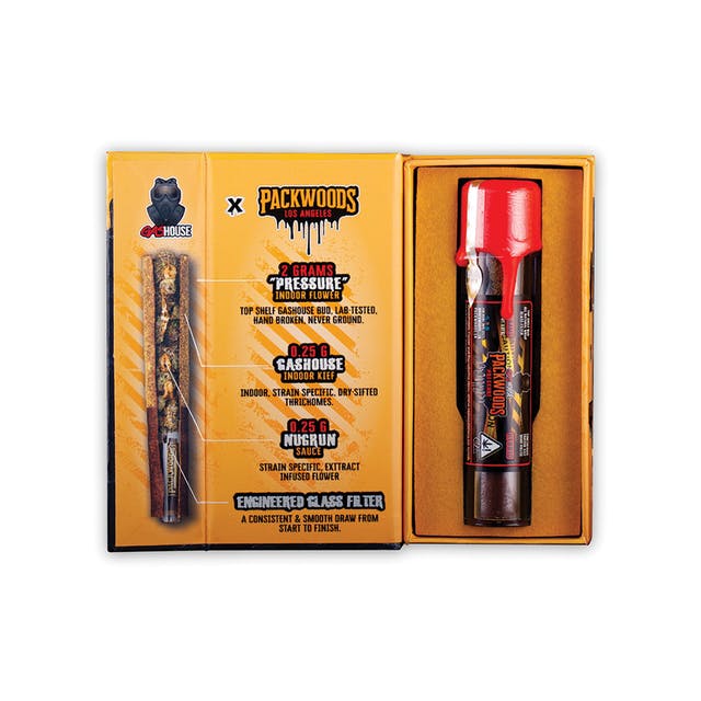 This Packwoods x Gas House Pressure collaboration contains 2g of Gas House premium indoor flower, dusted in 0.25g Kief and infused with 0.25g of premium Gas House nugrun sauce.